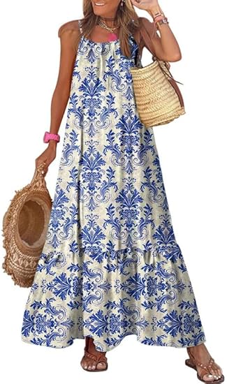 Women Summer Dresses 2024 Spaghetti Strap Scoop Neck Smocked Ruffle Flowy Boho Maxi Dress