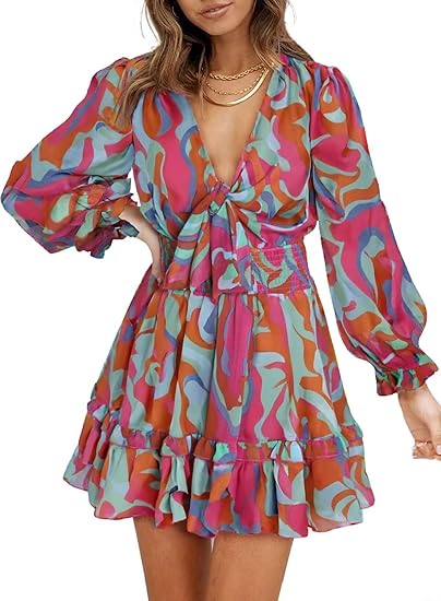 Womens Fall Fashion 2024 Deep V Neck Knotted Tiered Chiffon Elegant Mini Short Swing Skater Dress Wedding Guest Dress