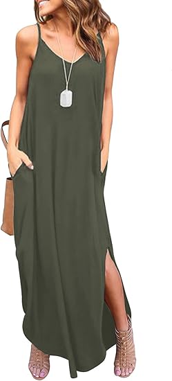 Women's Summer Casual Sleeveless V Neck Strappy Split Loose Dress Beach Cover Up Long Cami Maxi Dresses with Pocket