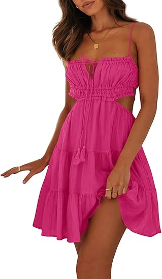 Women's Summer Beach Mini Dress Adjustable Spaghetti Straps Sexy Backless Tiered Sleeveless Boho Dresses