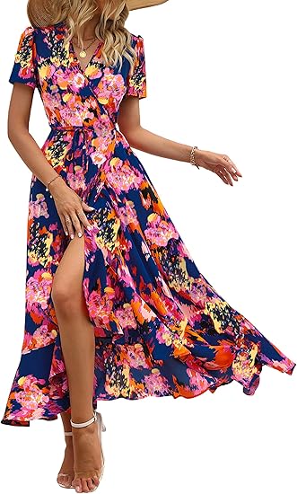 Women's Summer Wrap Maxi Dress Casual Boho Floral V Neck Short Sleeve Ruffle Hem Split Beach Long Dresses