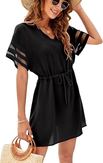 Women Swimsuit Coverup V Neck Casual Summer Cover Ups Flowy Short Sleeve Mini Beach Dress