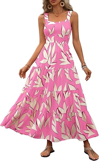 Women's Summer Floral Maxi Dress Sleeveless Smocked Tiered Ruffle Long Flowy Cute Casual Beach Boho Sundresses
