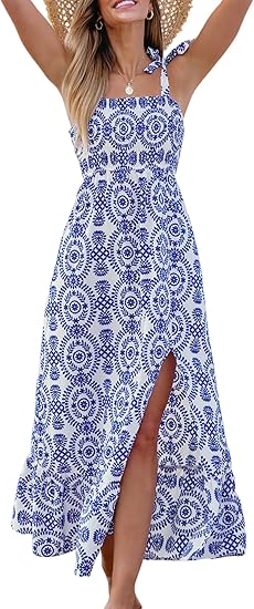 Women's Maxi Dress Smocked Straps Paisley Ruffled Slit A Line Long Beach Summer Dress 2024