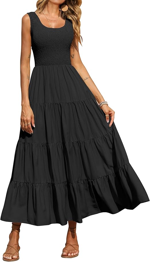Women's 2024 Casual Loose Plain Maxi Sundress Smocked Tank Dress Sleeveless Summer Beach Tiered Long Dresses